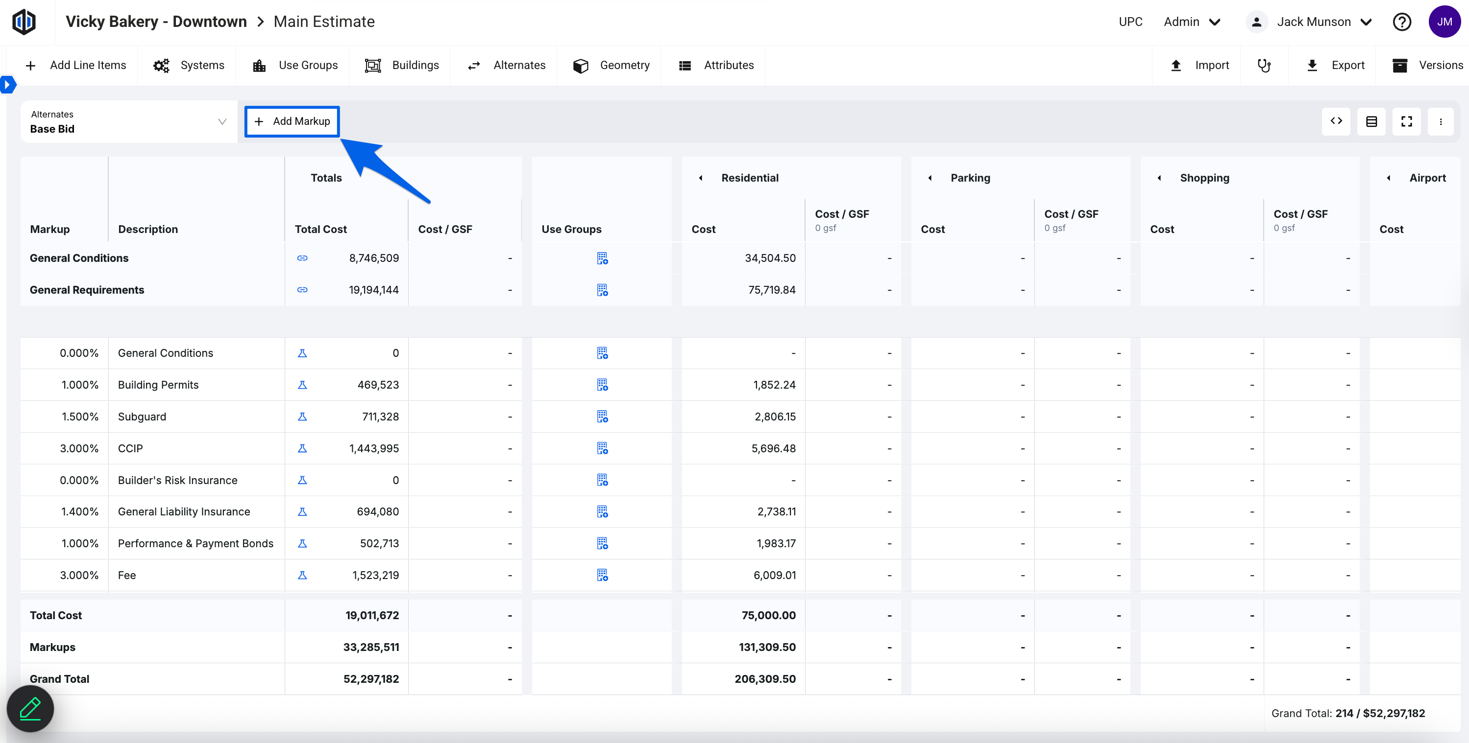 You can also view some high-level information about the building's Gross Area and Unit Counts, and at the bottom we can see our cost totaled for our Trades (Total Cost), or Markups (Markups Total), and the Trades and Markups combined for the Grand Total.